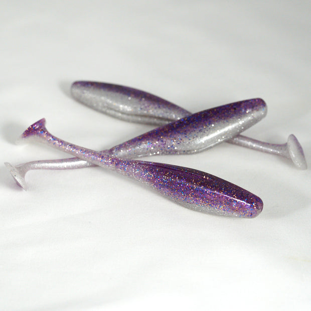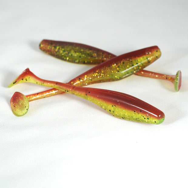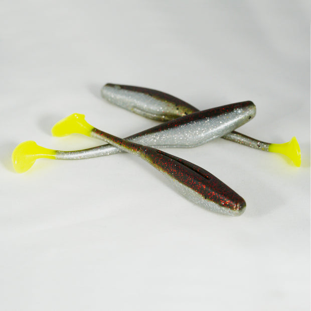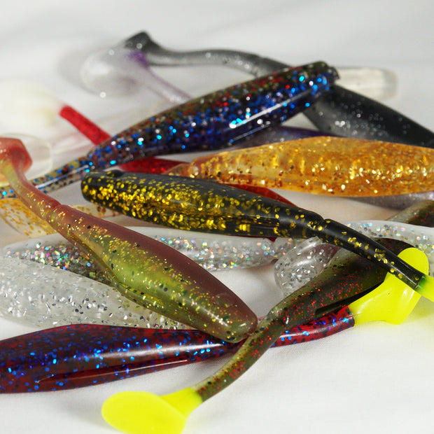 6 pack. This 5-inch bait is extremely versatile which allows you to work it many different ways. Mirroring the Ball Tail Shad body, but incorporating a paddle style tail, this bait can do it all. It has a unique double layer hook slot on both the back and the belly that covers any weedless application. It also has an “action” hinge that gives the tail plenty of action with minimal movement. This bait can be slow rolled, bounced or just a steady retrieve; either way, big fish have a hard time resisting it!